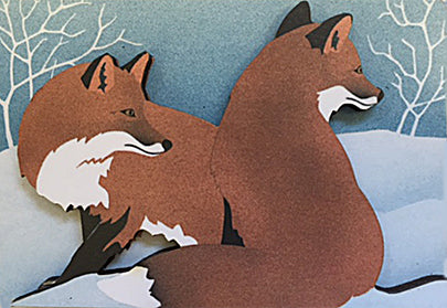 2 layer resting red foxes magnet made of wood. 3 x 2 inches