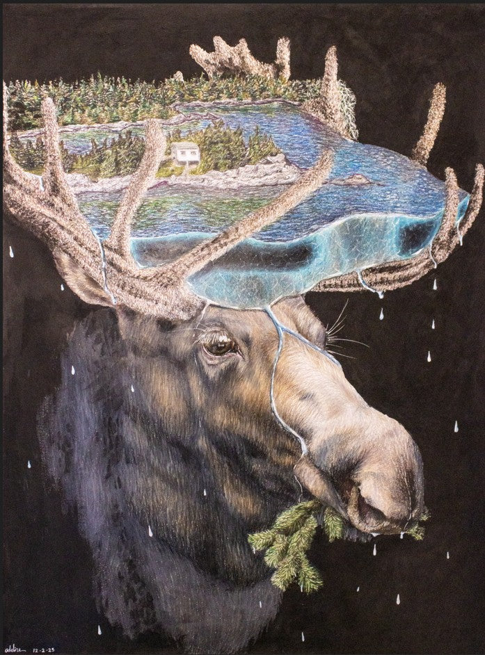 "Seeing moose on Isle Royale, as well as learning about how deeply they are intertwined with each aspect of the island, inspired me to create a piece portraying their guardianship of the natural world."